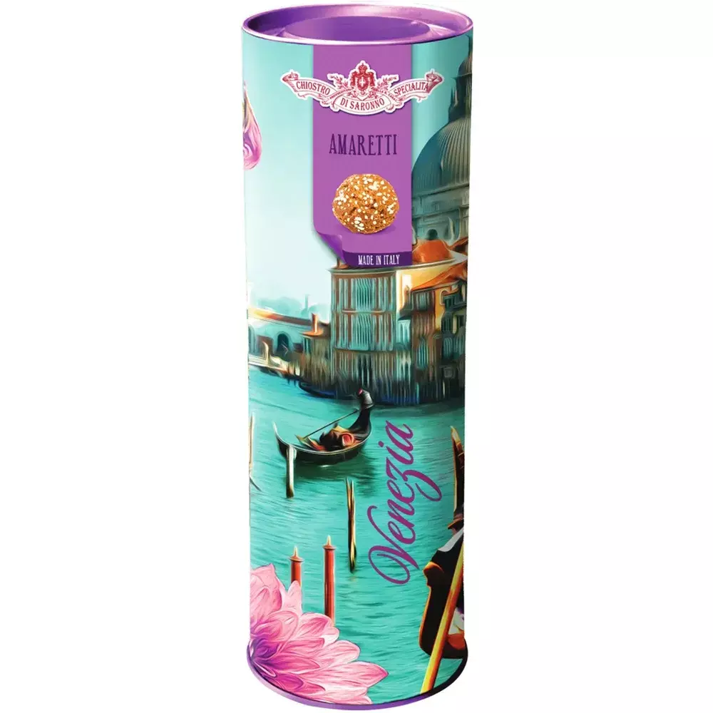 Los Amaretti Venezia de 150 gramos son galletas italianas tradicionales, crujientes y con un intenso sabor a almendras, que a menudo se presentan en una lata decorativa. Son un producto clásico, elaborado típicamente con pocos ingredientes: almendras molidas, clara de huevo y azúcar.