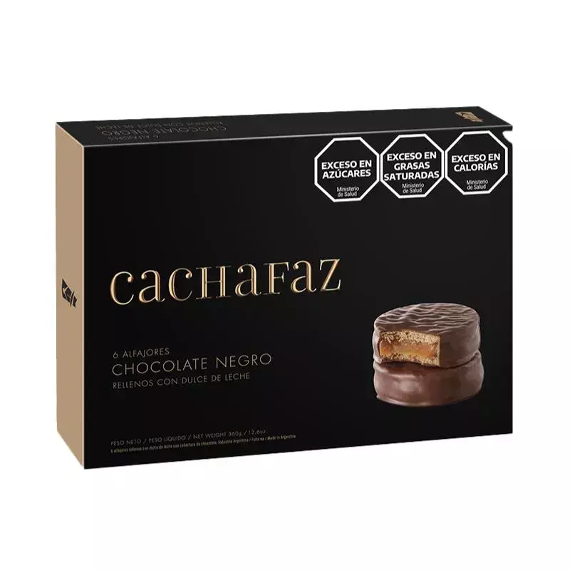 - Caja con 360 gramos de alfajores Cachafaz en su versión negra
